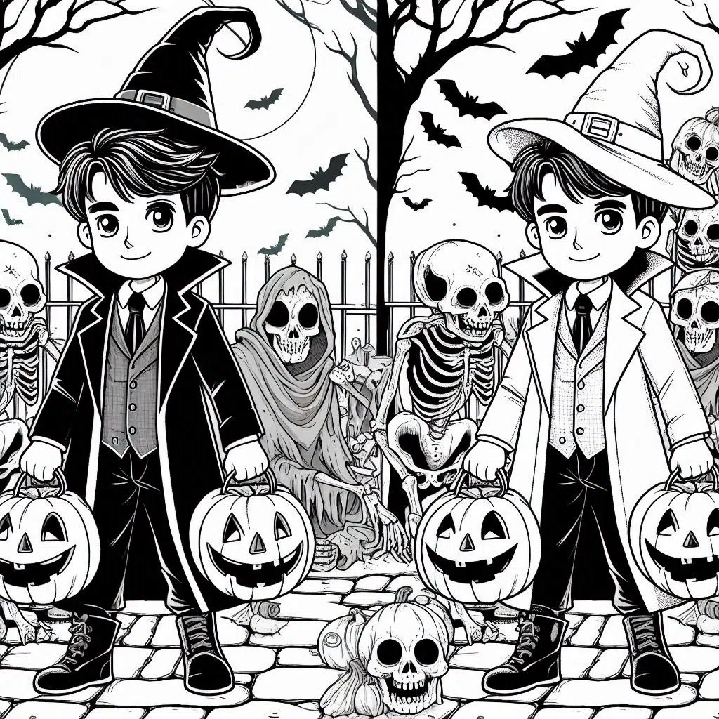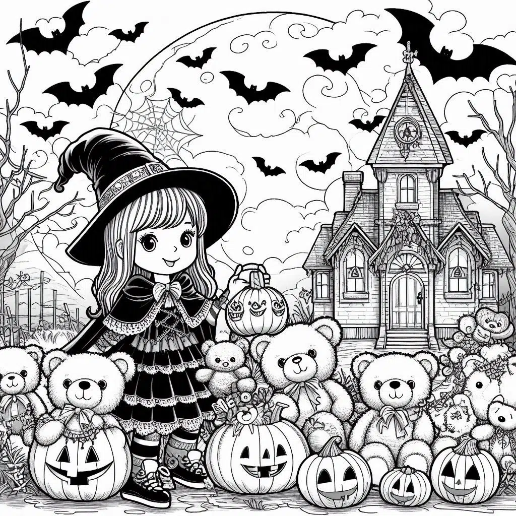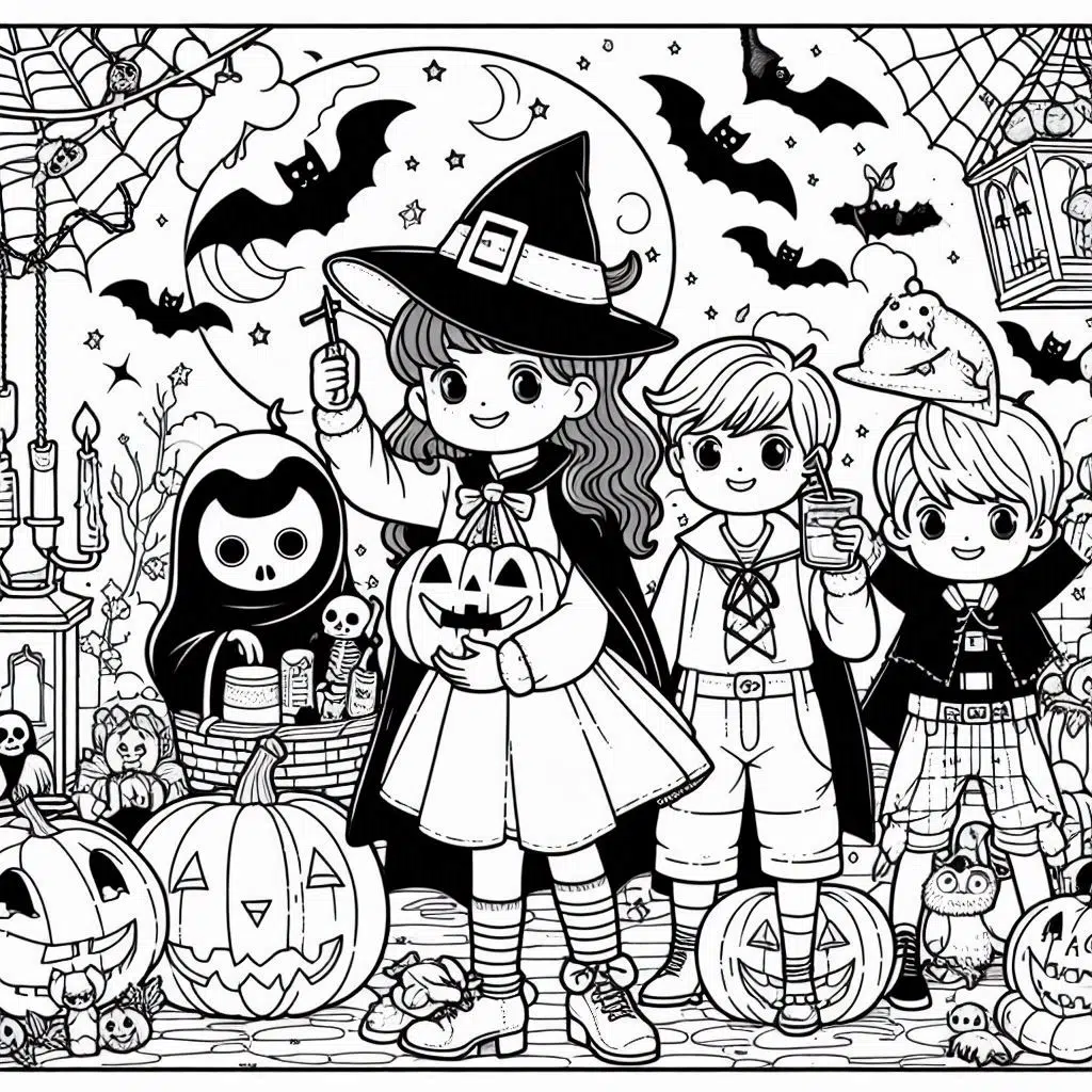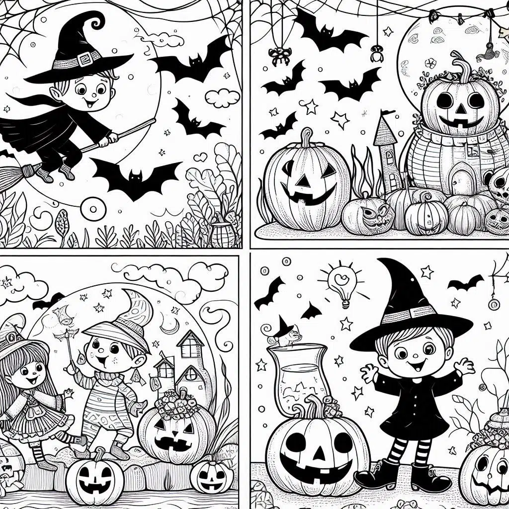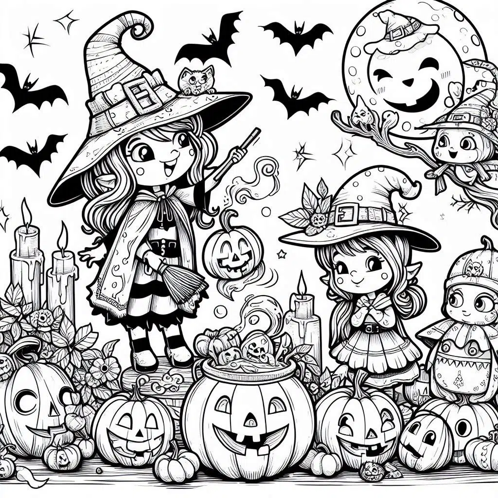 - Sorcières et chauves-souris : Invitez-les à colorier des sorcières sur leur balai et des chauves-souris en pleine vol.